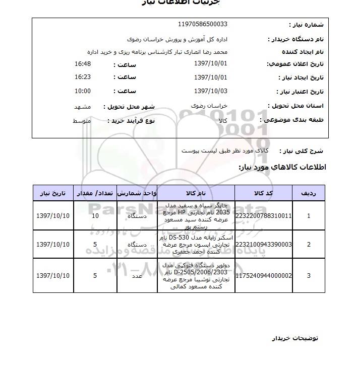 | 3 | 1175240944000002 | دولوپر دستگاه فتوکپی مدل d-2505/2006/2303 نام تجارتی توشیبا مرجع عرضه کننده مسعود کمالی | عدد | 5 | 97.10.10 |