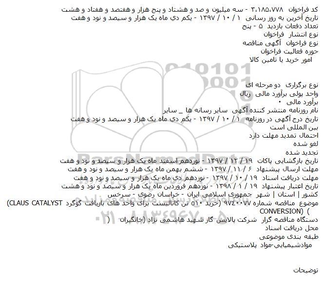 موضوع  مناقصه شماره ٩٧٤٠٠٧٧ (خرید ٥١٠ تن كاتالیست برای واحد های بازیافت گوگرد (CLAUS CATALYST CONVERSION)