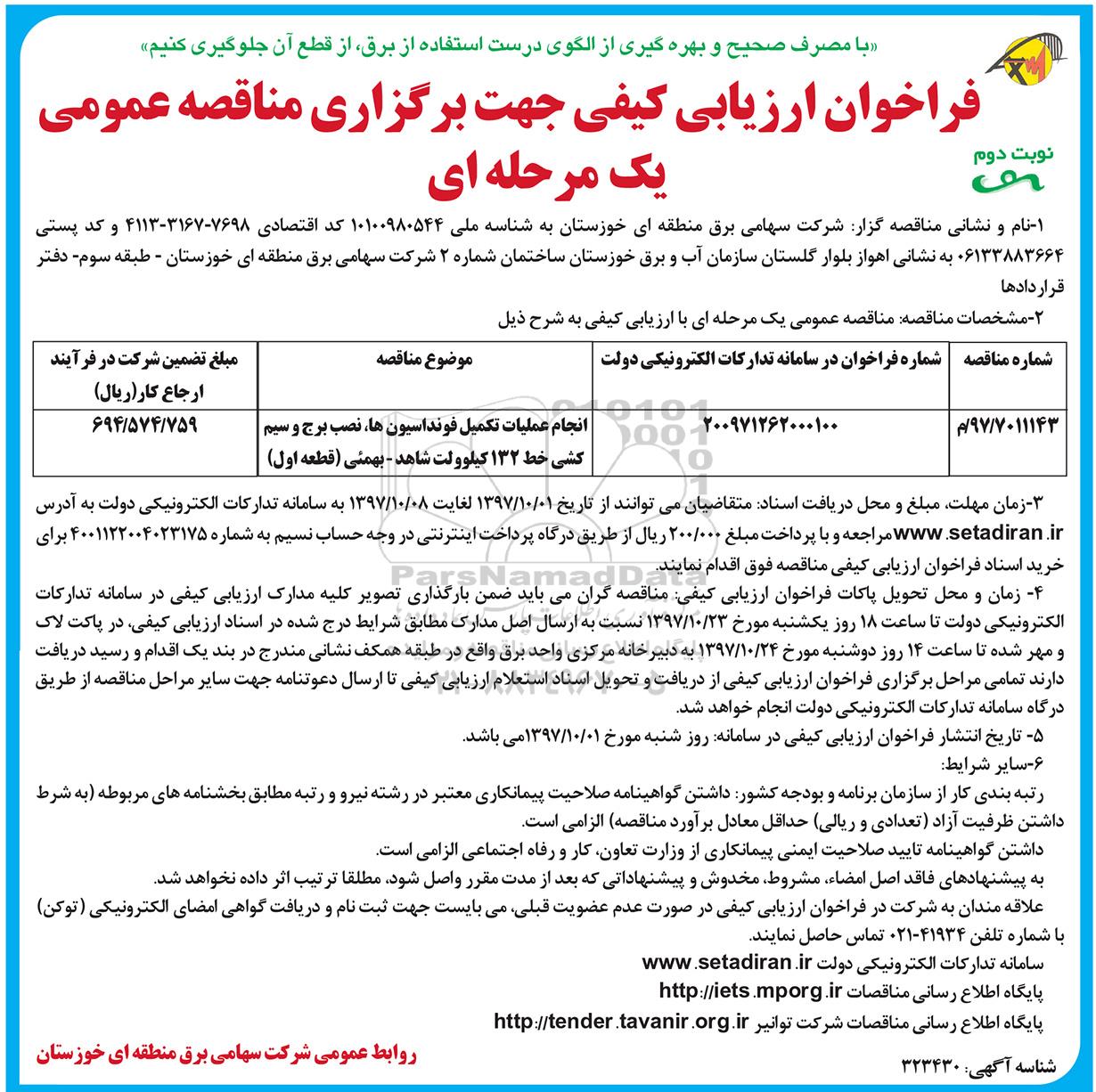 | 97/7011143/م | 200971262000100 | انجام عملیات تکمیل فونداسیون ها، نصب برج و سیم کشی خط 132 کیلوولت شاهد - بهمئی (قطعه اول) |
