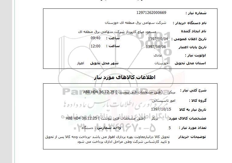 نام دستگاه خریدار : شرکت سهامی برق منطقه ای خوزستان