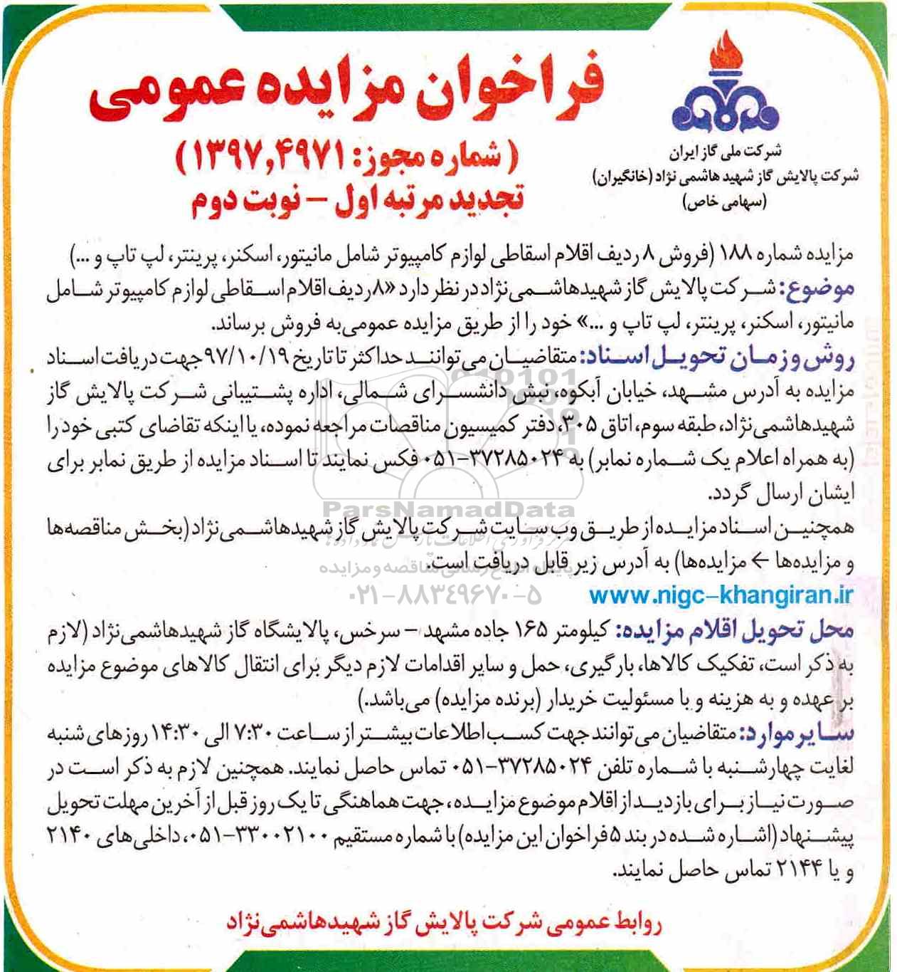 موضوع: شرکت پالایش گاز شهید هاشمی نژاد در نظردارد 8 ردیف اقلام اسقاطی لوازم کامپیوتر شامل مانیتور، اسکنر، پرینتر، لپ تاپ و...) خود را از طریق مزایده عمومی به فروش برساند.