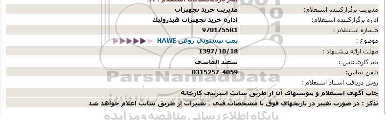 اداره برگزارکننده استعلام: اداره خرید تجهیزات هیدرولیک