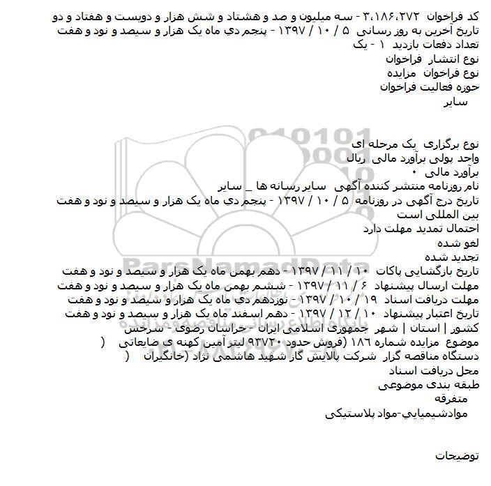 موضوع مزایده شماره ١٨٦ (فروش حدود ٩٣٧٢٠ لیتر آمین كهنه ی ضایعاتی)