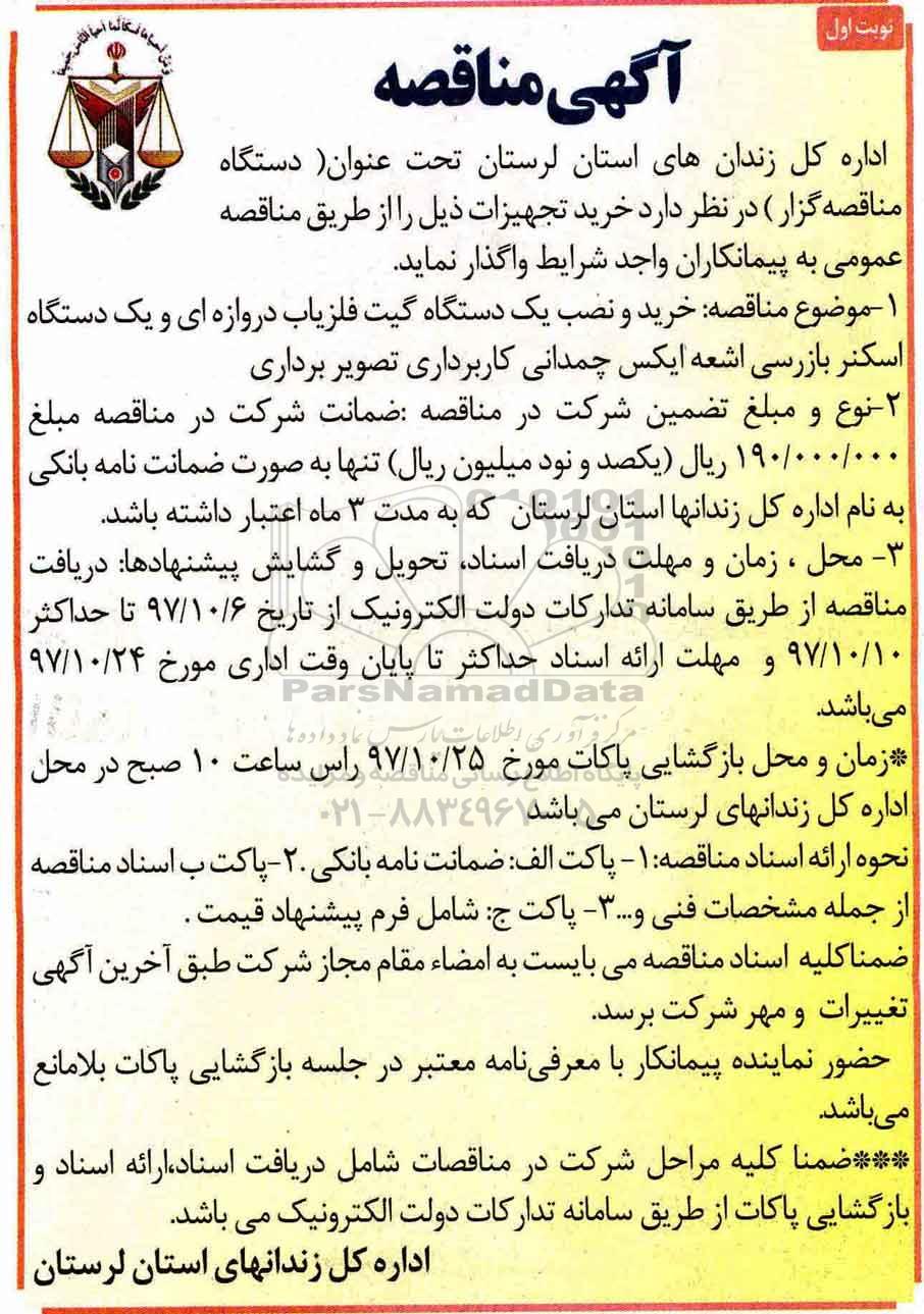 اداره کل زندان های استان لرستان تحت عنوان (دستگاه مناقصه گزار) در نظر دارد خرید تجهیزات ذیل را از طریق مناقصه عمومی به پیمانکاران واجد شرایط واگذار نماید.