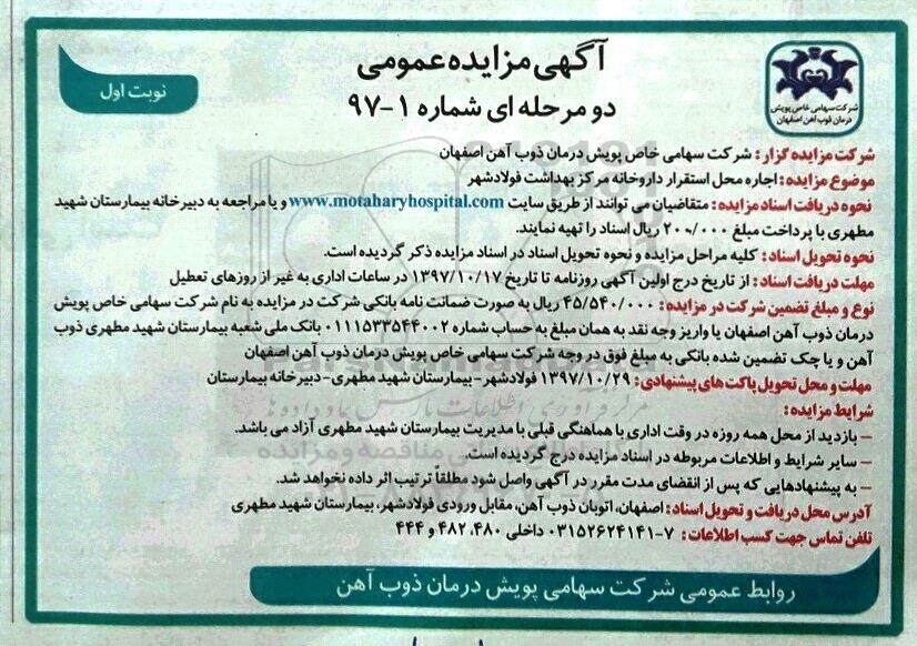 موضوع مزایده اجاره محل استقرار داروخانه مرکز بهداشت فولادشهر