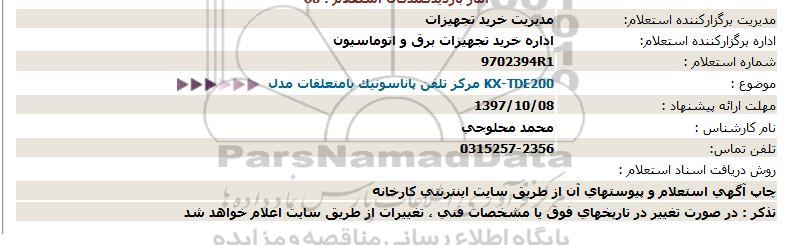 اداره برگزارکننده استعلام: اداره خرید تجهیزات برق و اتوماسیون