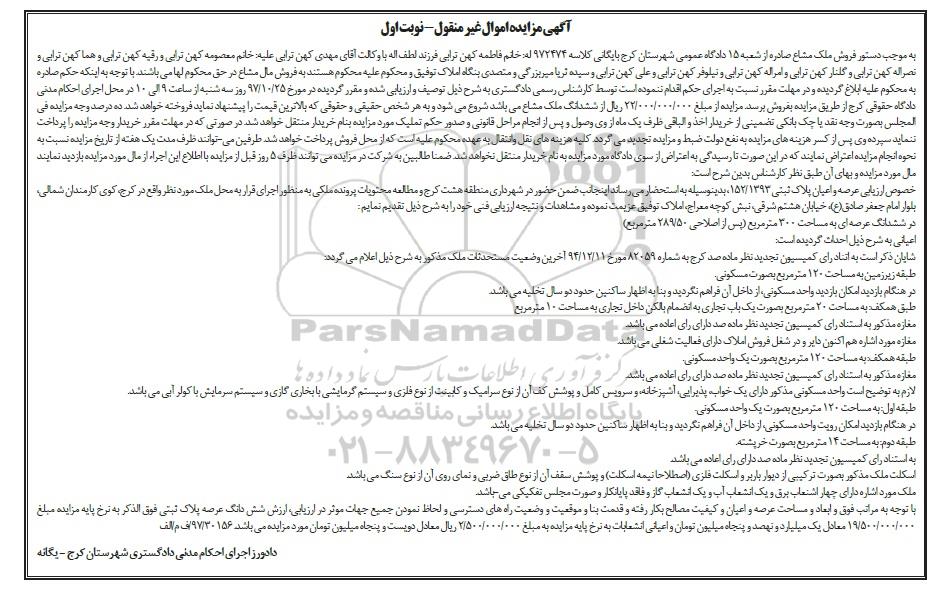 مزایده عرصه و اعیان پلاک ثبتی 152.1393 نوبت اول کلاسه 972474