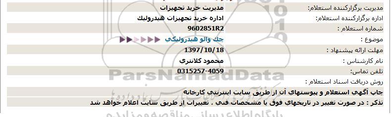 اداره برگزارکننده استعلام: اداره خرید تجهیزات هیدرولیک