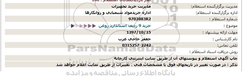 استعلام خرید 9 ردیف استاندارد روغن , استعلام، استعلام خرید 9 ردیف استاندارد روغن