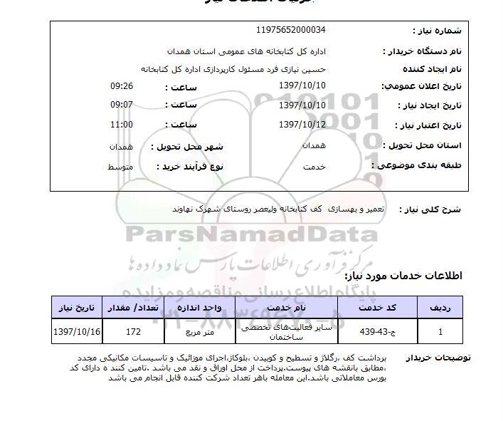 شرح کلی نیاز: تعمیر و بهسازی کف کتابخانه ولیعصر روستای شهرک نهاوند
