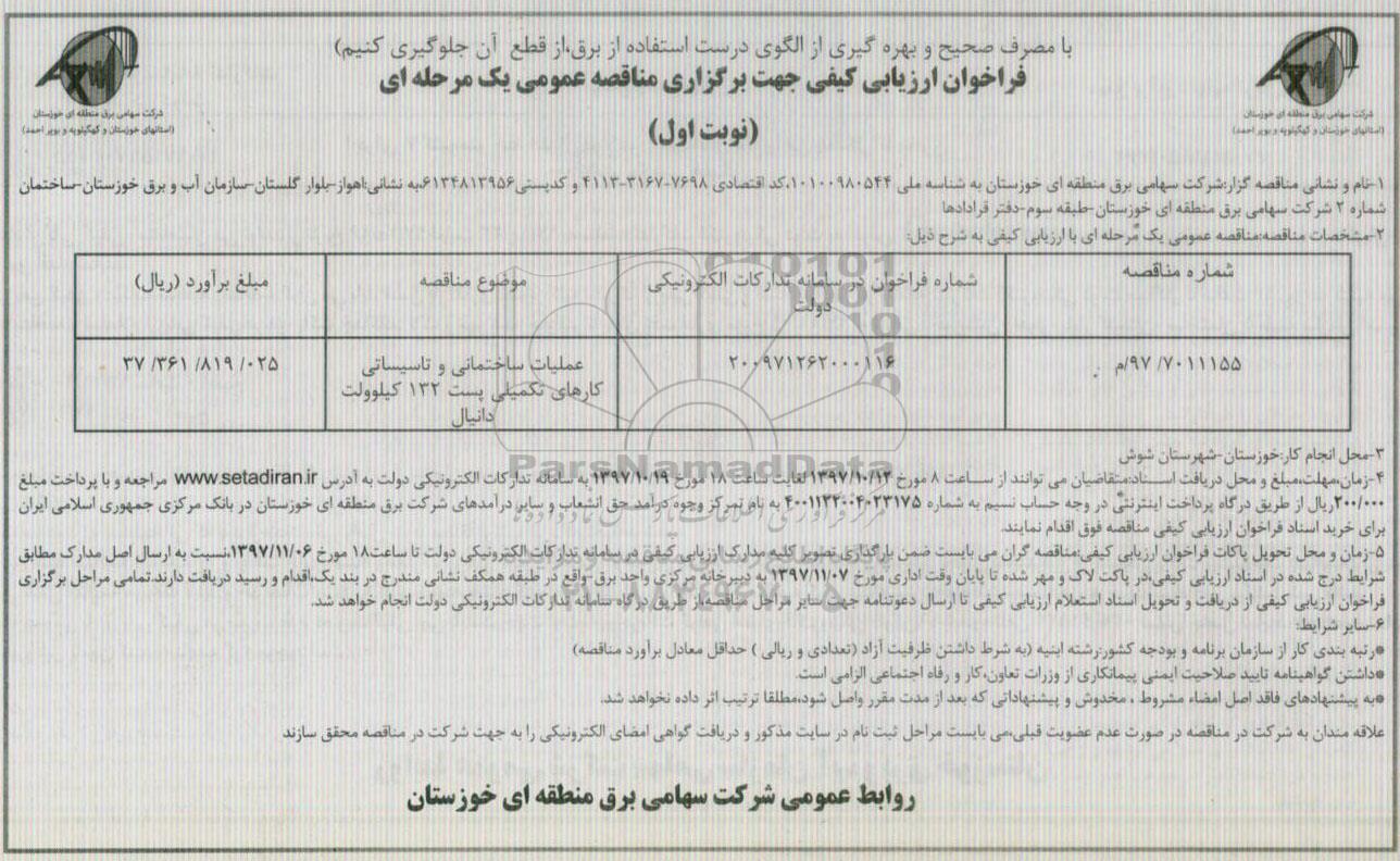 | 97/7011155/م | 200971262000116 | عملیات ساختمانی و تاسیساتی کارهای تکمیلی پست 132 کیلوولت دانیال |