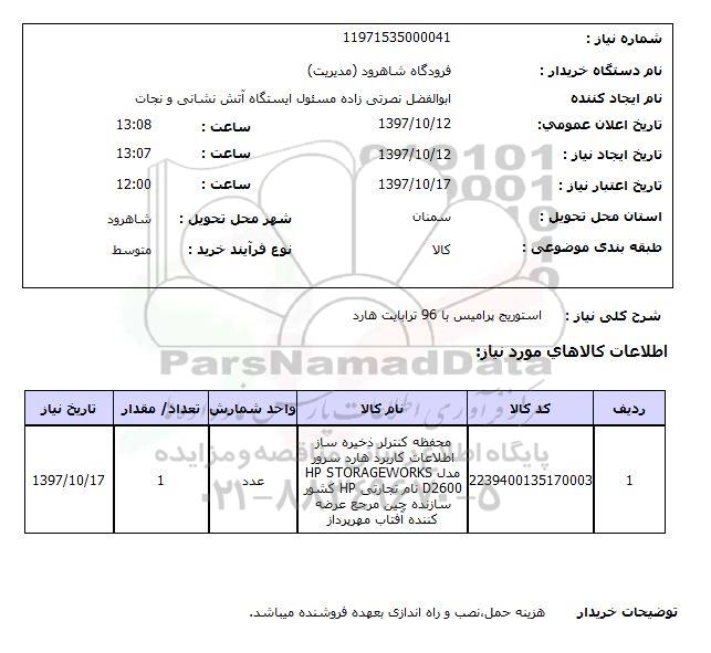 | 2239400135170003 | محفظه کنترلر ذخیره ساز اطلاعات کاربرد هارد سرور مدل hp storageworks d2600 نام تجارتی hp کشور سازنده چین مرجع عرضه کننده آفتاب مهرپرداز | عدد | 1 | 97.10.17 |