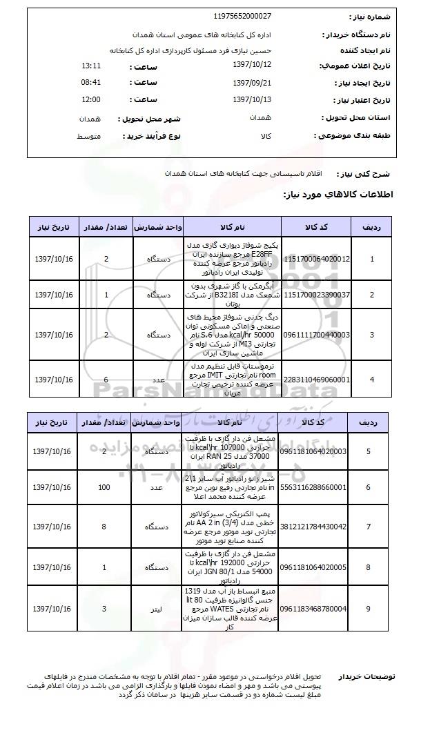 شرح کلی نیاز: اقلام تاسیساتی جهت کتابخانه های استان همدان