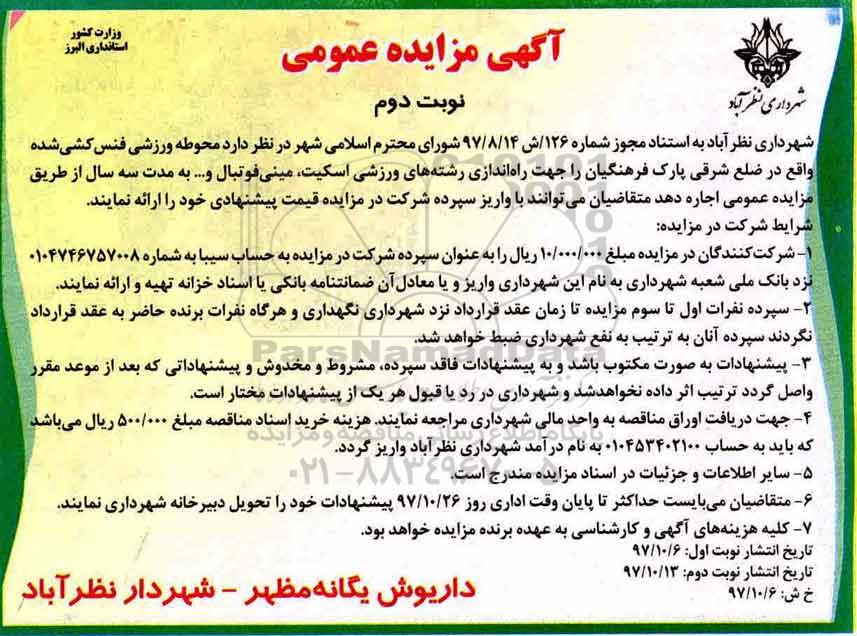 شهرداری نظرآباد به استناد مجوز شماره  126/ ش / 14/ 8 / 97  شورای محترم اسلامی شهر شهرداری در نظر دارد محوطه ورزشی فنس کشی شده واقع در ضلع شرقی پارک فرهنگیان را جهت راه اندازی رشته های ورزشی اسکیت، مینی فوتبال و... به مدت سه سال از طریق مزایده عمومی اجاره دهد متقاضیان می توانند با واریز سپرده شرکت در مزایده قیمت پیشنهادی خود را ارایه نمایند.