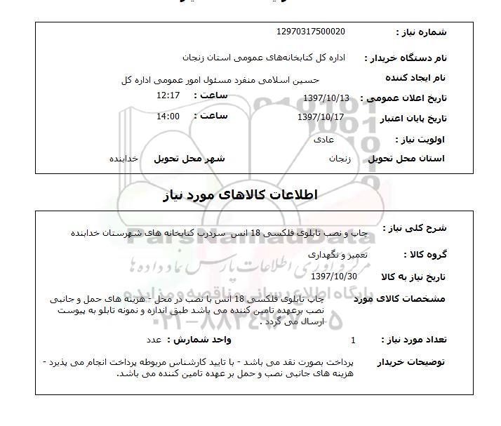 شرح کلی نیاز: چاپ و نصب تابلوی فلکسی 18 انس سردرب کتابخانه های شهرستان خدابنده