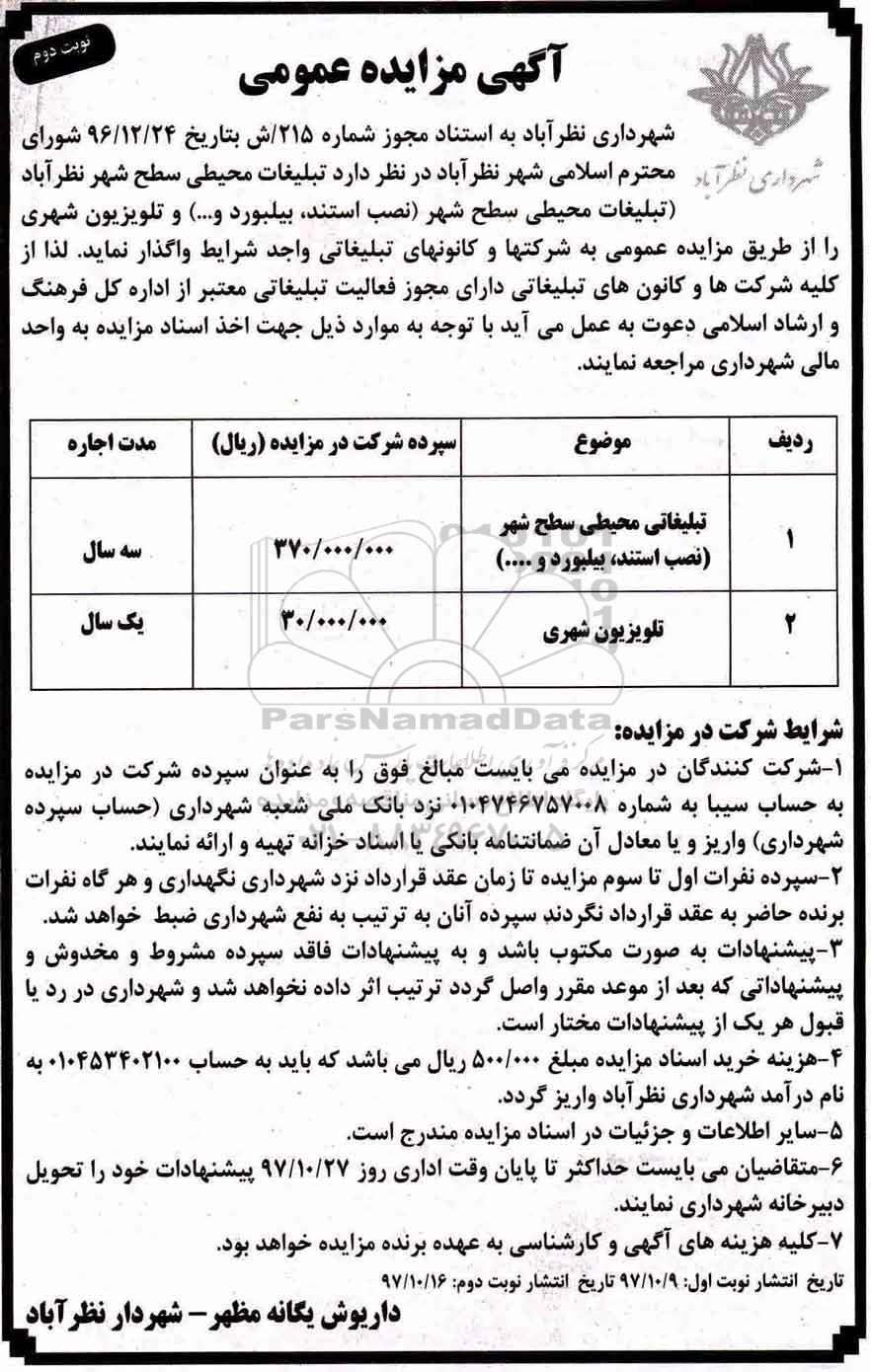 شهرداری نظرآباد در نظر دارد تبلیغات محیطی سطح شهر نظرآباد (نصب استند، بیلبورد و ...) و تلویزیون شهری را از طریق مزایده عمومی به شرکتها و کانونهای تبلیغاتی واجد شرایط واگذار نماید. لذا از کلیه شرکتها و کانونهای تبلیغاتی دارای مجوز فعالیت تبلیغاتی معتبر از اداره کل فرهنگ و ارشاد اسلامی دعوت به عمل می آید با توجه به موارد ذیل جهت اخذ اسناد مزایده به واحد مالی شهرداری مراجعه نمایند