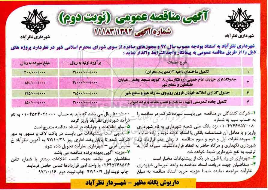 شهرداری نظر آباد در نظر دارد پروژه های ذیل را از طریق مناقصه عمومی به پیمانکار واجد الشرایط واگذار نماید.