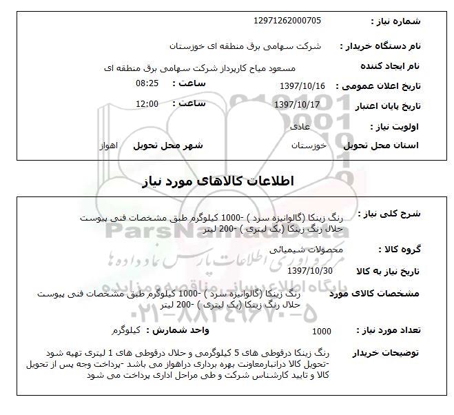 شرح کلی نیاز:  رنگ زینکا (گالوانیزه سرد) - 1000 کیلوگرم طبق مشخصات فنی پیوست