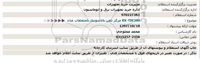 اداره برگزارکننده استعلام: اداره خرید تجهیزات برق و اتوماسیون