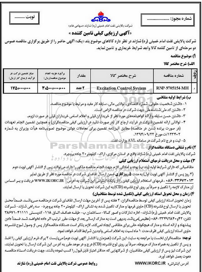 شرکت پالایش نفت امام خمینی (ره) شازند در نظر دارد کالاهای موضوع بند یک آگهی حاضر را از طریق برگزاری مناقصه عمومی دو مرحله ای از تامین کننده واجد شرایط خریداری و تامین نماید.