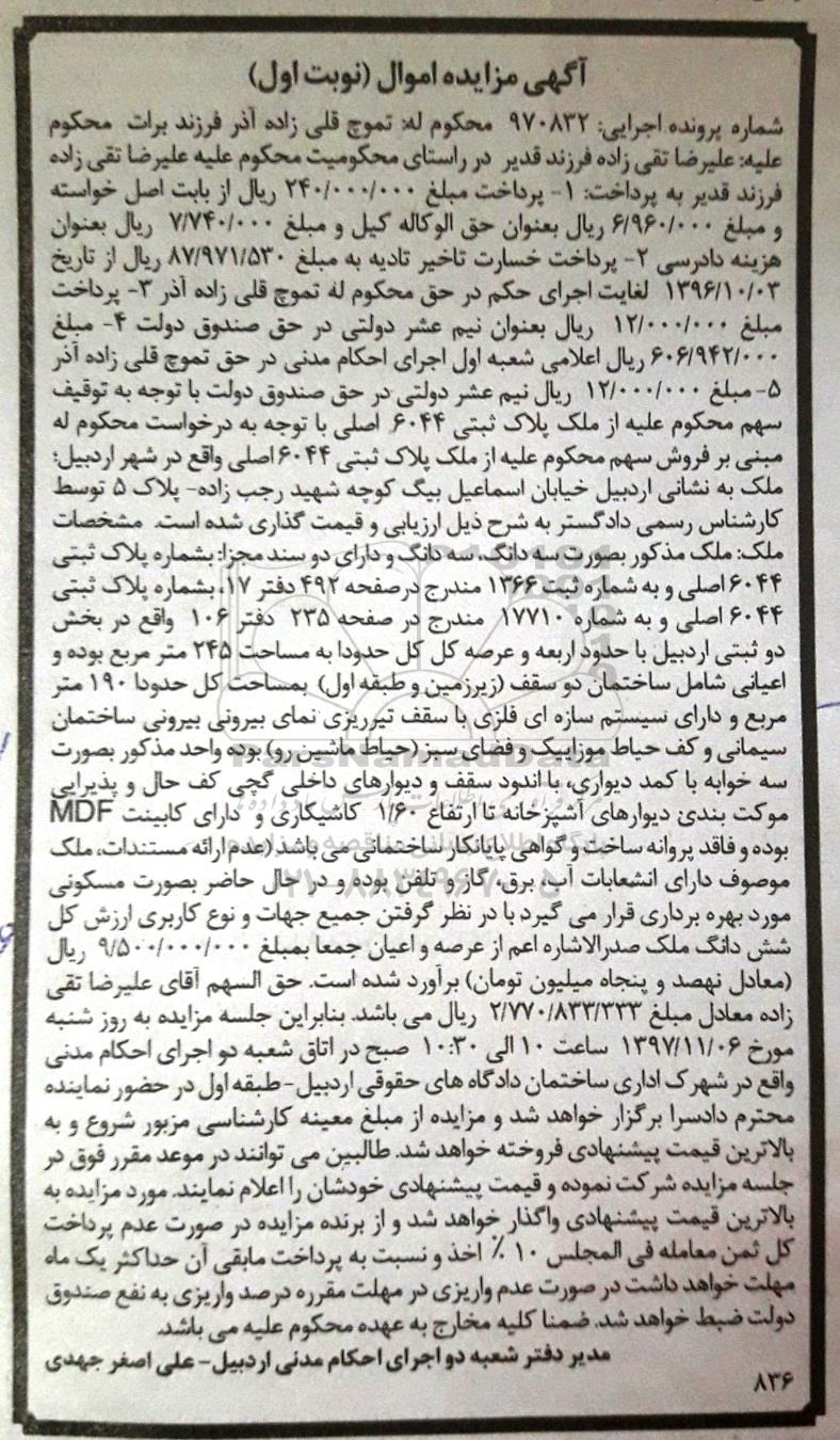 مزایده سه دانگ پلاک ثبتی 6044 اصلی نوبت اول پرونده 970832