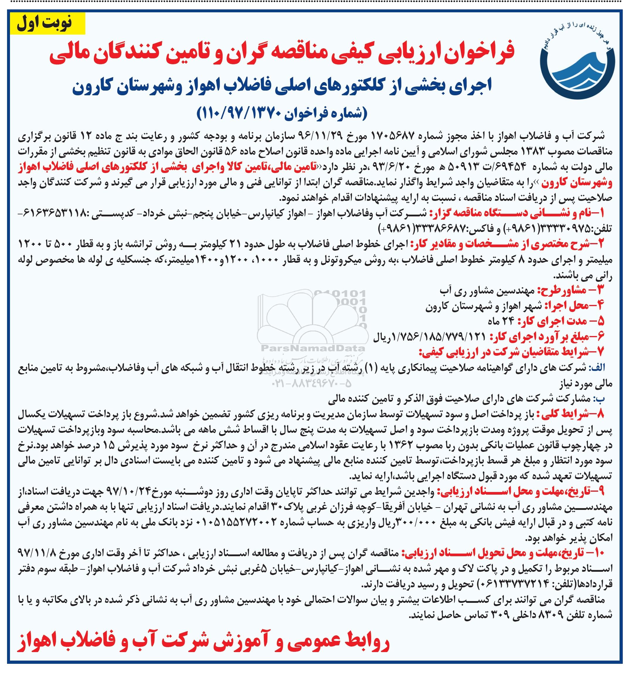 10. تاریخ، مهلت و محل تحویل اسناد ارزیابی : مناقصه گران پس از دریافت و مطالعه اسناد ارزیابی، حداکثر تا آخر وقت اداری مورخ 97.11.08 اسناد مربوطه را تکمیل و در پاکت لاک و مهر شده به نشانی اهواز- کیانپارس، خیابان 5 غربی نبش خرداد شرکت آب و فاضلاب اهواز، طبقه سوم دفتر قراردادها تلفن 06133737214 تحویل و رسید دریافت دارند