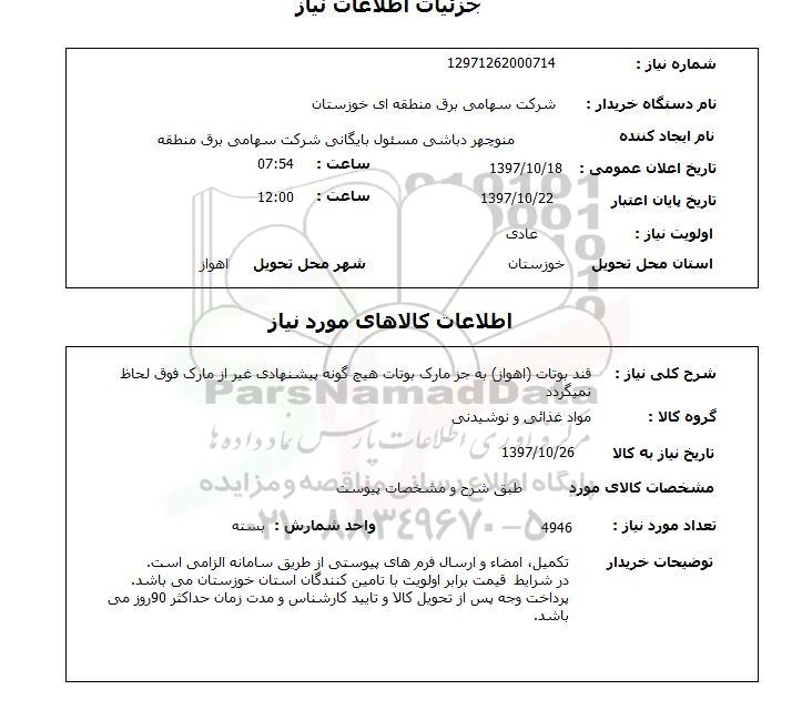 شرح کلی نیاز: قند بوتات (اهواز) به جز مارک بوتات هیچگونه پینشهادی غیر از مارک فوق لحاظ نمیگردد