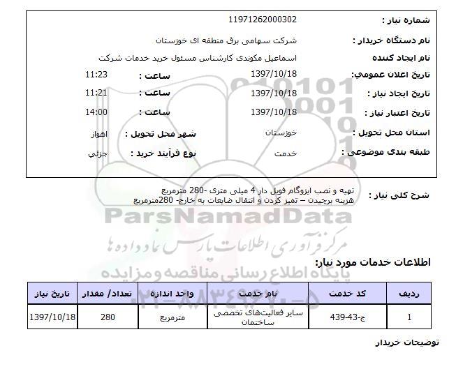 شرح کلی نیاز: تهیه و نصب ایزوگام فویل دار 4 میلی متری-280 متر مربع هزینه برچیدن تمیز کردن و انتقال ضایعات به خارج -280 مترمربع