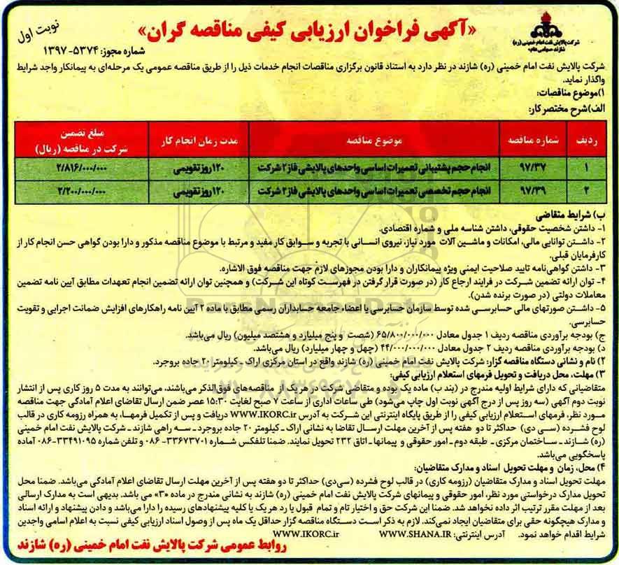 | 2 | 97/39 | انجام حجم تخصصی تعمیرات اساسی واحدهای پالایشی فاز 2 شرکت |