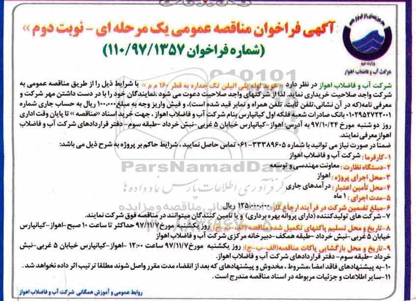 شرکت آب و فاضلاب اهواز در نظر دارد خرید لوله پلی اتیلن تک جداره به قطر 160 م م با شرایط ذیل از طریق مناقصه عمومی به شرکت واجد صلاحیت خریداری نماید. لذا از شرکتهای واجد صلاحیت دعوت می شود نمایندگان خود را با در دست داشتن مهر شرکت و معرفی نامه که در آن نشانی تلفن ثابت تلفن همراه و نمابر قید شده است و فیش واریز وجه به مبلغ 100.000 ریال به حساب جاری شماره 0102952722001 بانک صادرات شعبه فلکه اول کیانپارس بنام شرکت آب و فاضلاب اهواز جهت خرید اسناد مناقصه تا پایان وقت اداری روز دوشنبه 97.10.24 به آدرس اهواز کیانپارس خیابان 5 غربی نبش خرداد طبقه سوم دفتر قراردادهای شرکت آب و فاضلاب معرفی نمایند