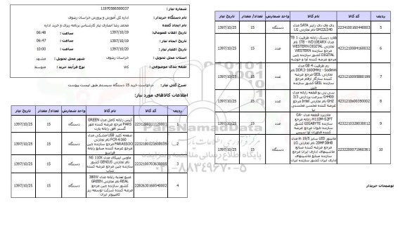 | 6 | 423120084160032 | هارد دیسک رایانه ظرفیت 1 TB مدل 1TB-WD10EARX نام تجارتی WESTERN DIGITAL مرجع سازنده WESTERN DIGITAL کشور سازنده چین مرجع عرضه کننده آوا و خوشه | عدد | 15 | 97.10.25 |
