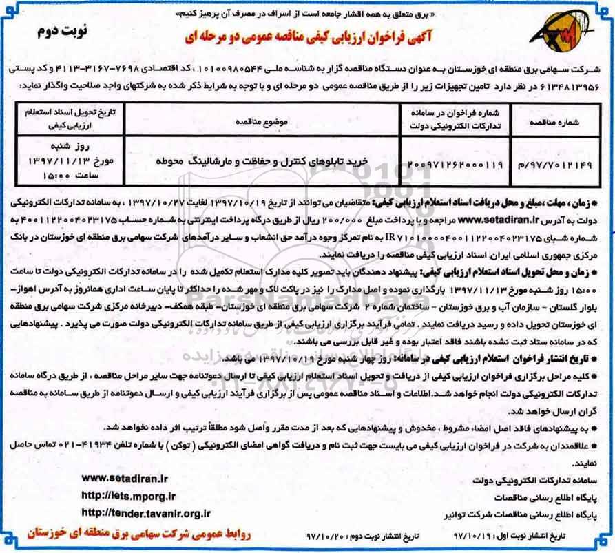 شرکت سهامی برق منطقه ای خوزستان به عنوان دستگاه مناقصه گزار به شناسه ملی 101009800544، کد اقتصادی 7698-3167-4113 و کد پستی 6134813956 در نظر دارد تامین تجهیزات زیر را از طریق مناقصه عمومی دو مرحله ای و با توجه به شرایط ذکر شده به شرکتهای واجد صلاحیت واگذار نماید