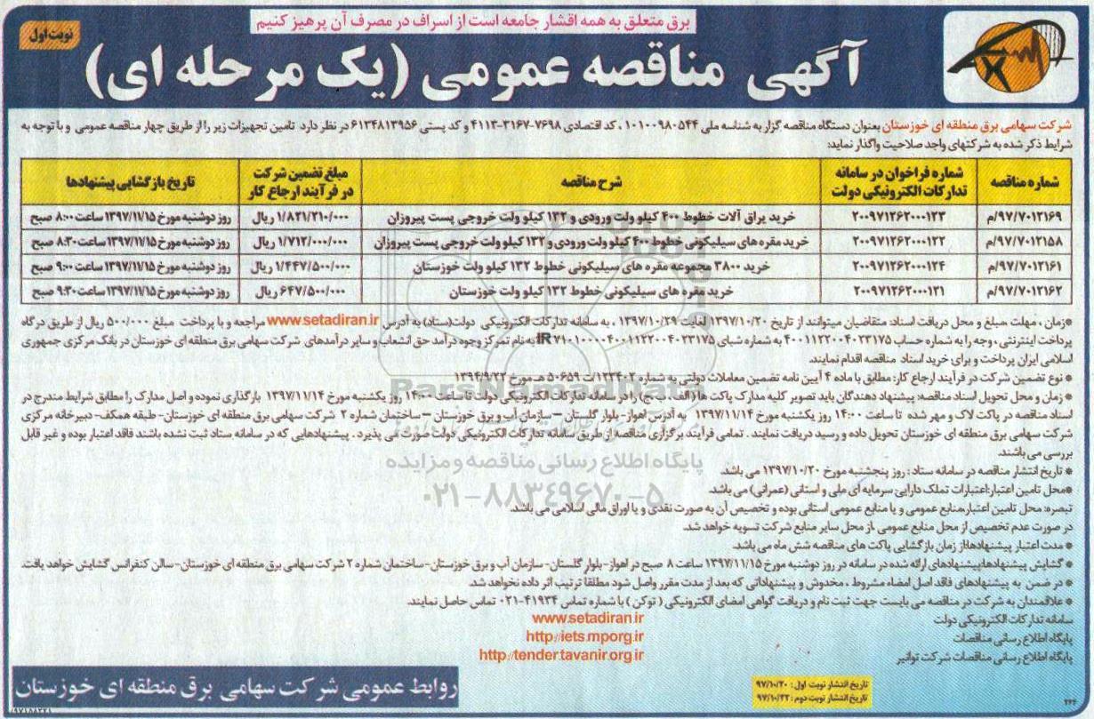 شرکت سهامی برق منطقه ای خوزستان به شناسه ملی 10100980544 کد اقتصادی 7698-3167-4113 و کد پستی 6134813956 در نظر دارد تامین تجهیزات زیر را از طریق چهار مناقصه عمومی و با توجه به شرایط ذکر شده به شرکتهای واجد صلاحیت واگذار نماید.