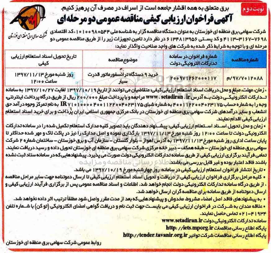 شرکت سهامی برق منطقه ای خوزستان به عنوان دستگاه مناقصه گزار به شناسه ملی 101009800544، کد اقتصادی 7698-3167-4113 و کد پستی 6134813956 در نظر دارد تامین تجهیزات زیر را از طریق مناقصه عمومی دو مرحله ای و با توجه به شرایط ذکر شده به شرکتهای واجد صلاحیت واگذار نماید