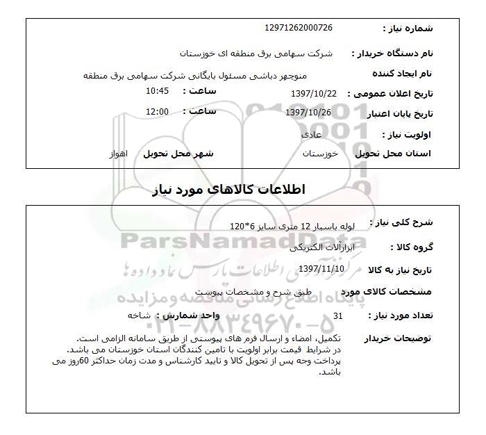 شرح کلی نیاز: لوله باسبار 12 متری سایز 6*120