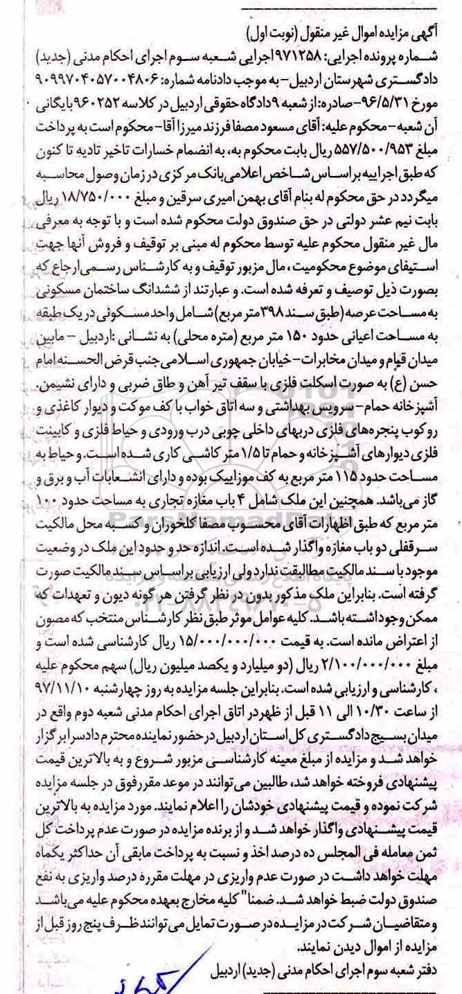 مزایده ششدانگ ساختمان مسکونی 398 مترمربع نوبت اول کلاسه 971258