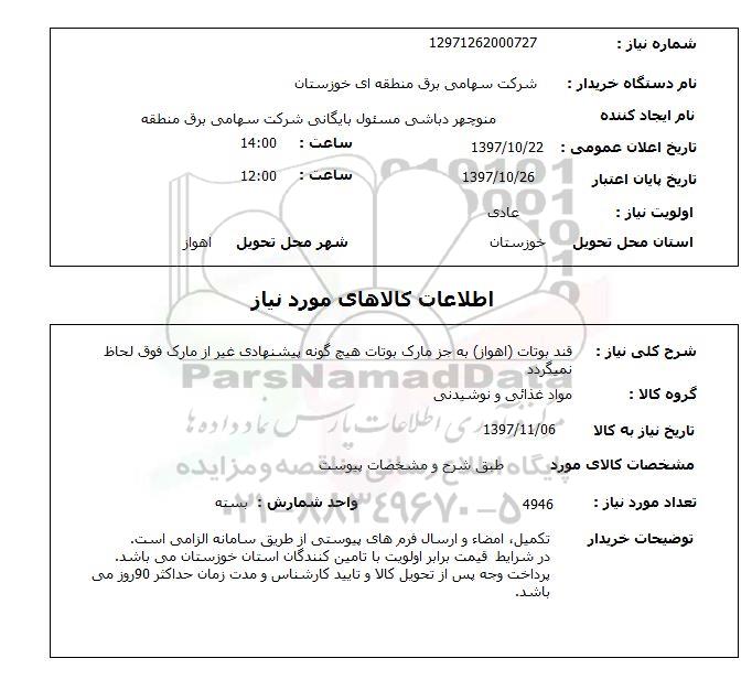 شرح کلی نیاز: قند بوتات (اهواز) به جز مارک بوتات هیچ گونه پیشنهادی غیر از مارک فوق لحاظ نمی گردد
