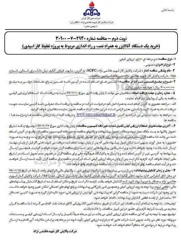 نوبت اول و دوم - مناقصه شماره 2940 -7-30900 خرید یک دستگاه آنالایزر به همراه نصب و راه اندازی مربوط به پروژه تغلیظ گاز اسیدی