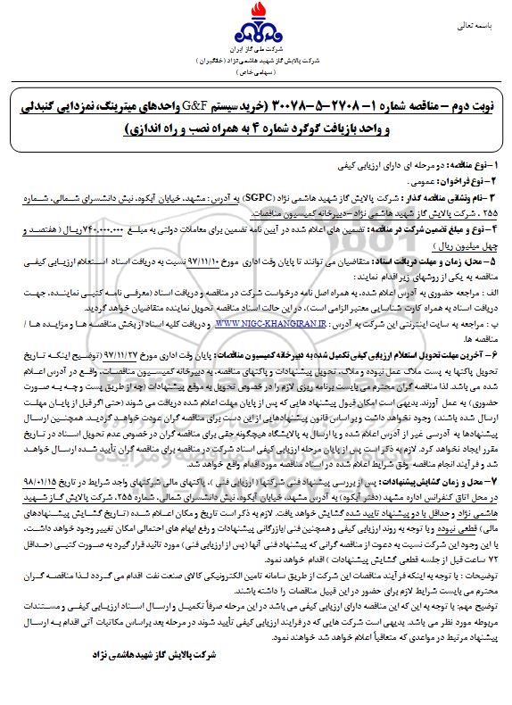 مناقصه خرید سیستم G & F واحدهای میترینگ ... , مناقصه ، مناقصه خرید سیستم G & F واحدهای میترینگ ...