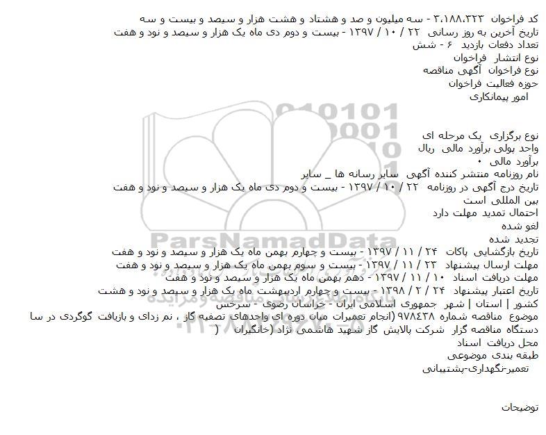موضوع  مناقصه شماره ٩٧٨٤٣٨ (انجام تعمیرات میان دوره ای واحدهای تصفیه گاز ، نم زدای و بازیافت گوگردی در سا