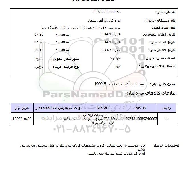 0974310059240003 | نشت یاب تاسیسات لوله آب مدل fsb-8d مرجع سازنده فرآیند ارقام پرداز | دستگاه | 1 | 97.10.30 |