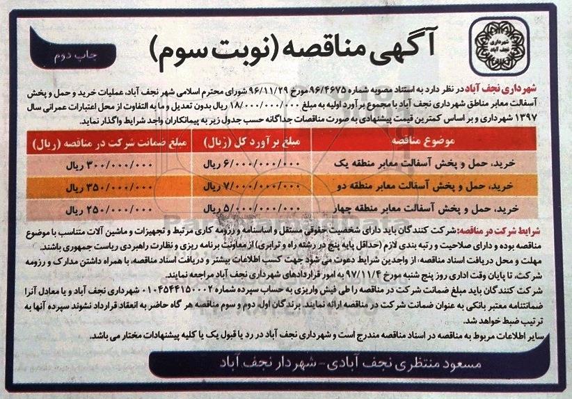 شهرداری نجف آباد در نظر دارد عملیات خرید و حمل و پخش آسفالت معابر مناطق شهرداری نجف آباد با مجموع برآورد اولیه به مبلغ 18.000.000.000 ریال بدون تعدیل و مابه التفاوت از محل اعتبارات عمرانی سال 1397 شهرداری و براساس کمترین قیمت پیشنهادی به صورت مناقصات جداگانه حسب جدول زیر به پیمانکاران واجد شرایط واگذار نماید.
