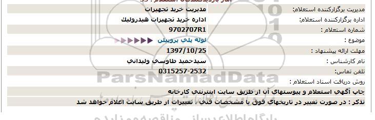 اداره برگزارکننده استعلام: اداره خرید تجهیزات هیدرولیك