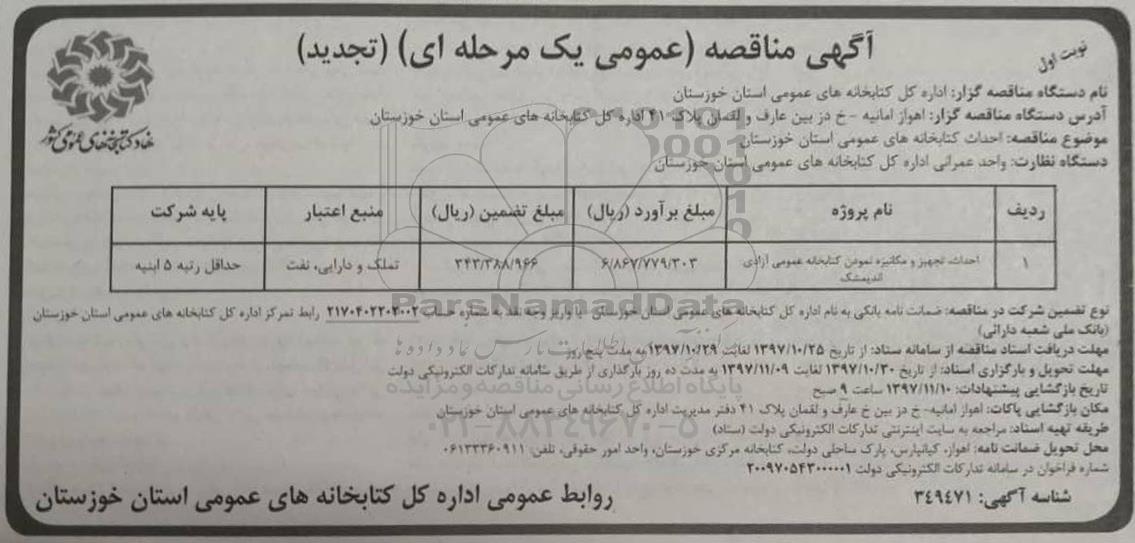 آدرس دستگاه مناقصه گزار: اهواز امانیه - خ دز بین عارف و لقمان پلاک 41 اداره کل کتابخانه های عمومی استان خوزستان