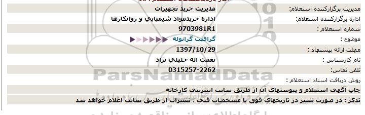 اداره برگزارکننده استعلام : اداره خرید مواد شیمیایی و روانکارها