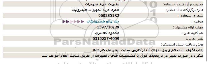 اداره برگزارکننده استعلام: اداره خرید تجهیزات هیدرولیک