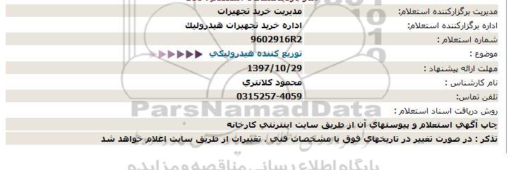 اداره برگزارکننده استعلام: اداره خرید تجهیزات هیدرولیک