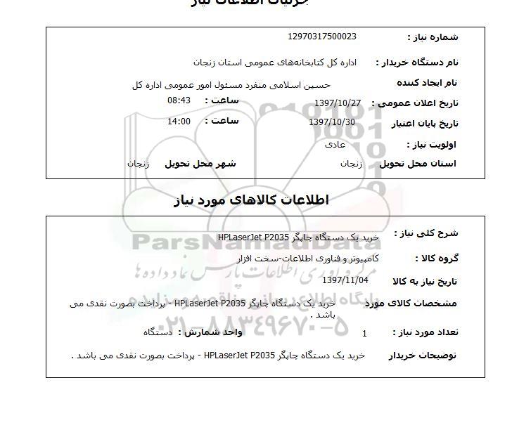 شرح کلی نیاز: خرید یک دستگاه چاپگر HPLaserJet P2035