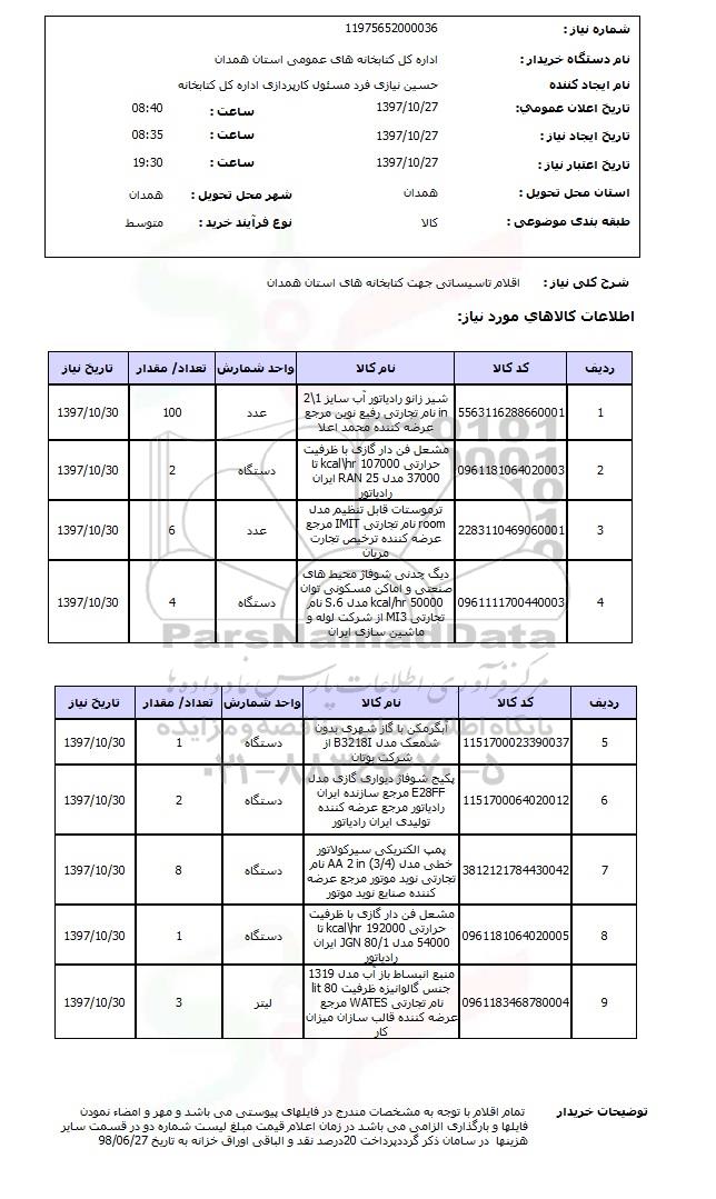 شرح کلی نیاز   اقلام تاسیساتی جهت کتابخانه های استان همدان