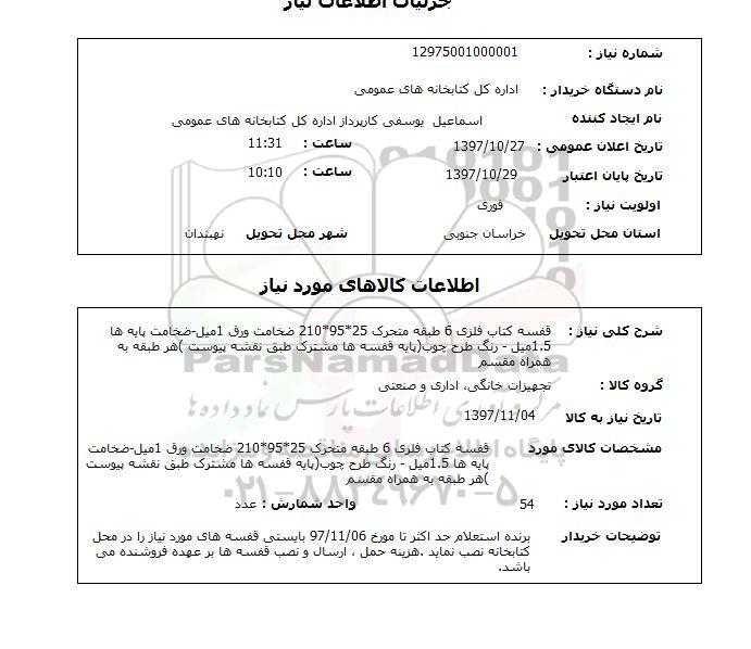 توضیحات خریدار : برنده استعلام حداکثر تا مورخ 97.11.6 بایستی قفسه های مورد نیاز را در محل کتابخانه نصب نماید. هزینه حمل ارسال و نصب قفسه ها بر عهده فروشنده می باشد